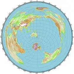 Map centered about Los Angeles, whose antipodal point is in the south Indian Ocean