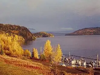 In 1993, the ferry Babine Charger was launched.[35] On the 40-minute crossing, the ferry can carry eight to nine logging trucks[36] for Canadian Forests Products.[37] The ferry runs from Michelle Bay (near Topley Landing) to Nose Bay.[38]