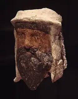 Painted clay and alabaster head of a Zoroastrian priest wearing a distinctive Bactrian-style headdress, Takhti-Sangin, Tajikistan, Greco-Bactrian kingdom, 3rd-2nd century BC.[36]
