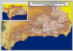 The Baetic System or Betic System (Spanish: Sistema Bético) is one of the main systems of mountain ranges in Spain. Located in the southern and eastern Iberian Peninsula, it is also known as the Cordilleras Béticas (Baetic Mountain Ranges) or Baetic Mountains. The name of the mountain system derives from the ancient Roman region of Baetica, one of the Imperial Roman provinces of ancient Hispania.