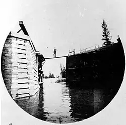 Completed lock at Canal Flats, ca 1889. The timber shown was cut from local ponderosa pine.