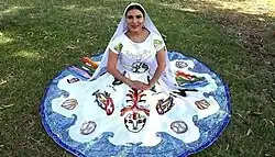Flor de Cucapá: Flor de Cucapá is the traditional attire of Baja California, created in 1954 as a symbol of cultural and regional identity for one of Mexico's youngest states. This iconic outfit was designed by María de la Cruz Pulido following a state-wide contest organized by the government to represent Baja California's rich natural and cultural heritage. Inspired by the region’s diversity, the attire consists of five pieces made of white cotton fabric, each imbued with symbolic meaning. The circular skirt features embroidered details of cacti and marine elements, representing the deserts and the Sea of Cortés.[23] The blouse includes an embroidered depiction of a woman with open arms, symbolizing the warmth and hospitality of the people of Baja California.[24]