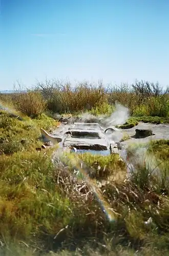 The hot springs and seeps are located in the Sevier Desert on Fumarole Butte which is a basaltic andesite type of shield volcano from the Quaternary period, overlaying basalt and rhyolite.[7] The hot water emerges from a travertine and alluvial mound (sometimes described as a tufa mound) that flank the eastern side of the basalt lava formation. The area is fenced, but accessible, and used primarily by locals. There are a series of concrete soaking tubs constructed west of the spring heads.[8]