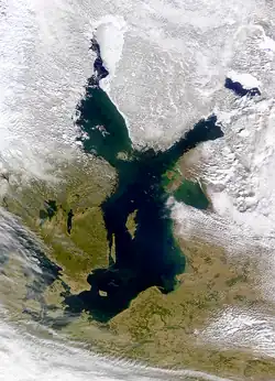 The Baltic Sea is an arm of the Atlantic Ocean that is enclosed by the countries of Denmark, Estonia, Finland, Germany, Latvia, Lithuania, Poland, Russia, Sweden, and the North and Central European Plain regions.[3] It is the world's largest brackish water basin.
