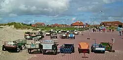 Baltrum is a completely car-free island, because of the traffic ban of all kind of motor vehicles. The only exceptions are vehicles of the volunteer fire department, an ambulance, a few wheel loaders and some machines needed for the coastal protection. From 1949 until 1985 there was a small single track Inselbahn Baltrum (English: Baltrum Island Railway) which was an unelectrified narrow gauge railway[5] for baggage and cargo transportation. No bicycle sharing system exists on Baltrum and the tourists are asked not to bring their own bicycles onto the island, riding bicycles is the privilege of inhabitants. The passenger and freight transportation is accomplished by horse-drawn carriages. The baggage is transported by two-wheeled or four-wheeled carts or also carriages, use of electrical bicycles is the latest trend.