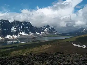 ![]() Bastion Peak in the very center of frame with Dungeon Peak and Redoubt Peak of The Ramparts to left | |