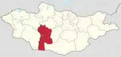 The Bayankhongor Province or Bayanhongor Aimag[a] is one of the 21 aimags (provinces) of Mongolia. It is located in the southwest of the country and, at 116,000 square kilometers, it is one of the largest aimags. The capital of the aimag shares the provincial name, Bayankhongor.
