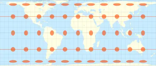 The Behrmann projection is a cylindrical equal-area map projection described by Walter Behrmann in 1910.[1] Cylindrical equal-area projections differ by their standard parallels, which are parallels along which the projection has no distortion. In the case of the Behrmann projection, the standard parallels are 30°N and 30°S. While equal-area, distortion of shape increases in the Behrmann projection according to distance from the standard parallels. The Behrmann projection has the property that half of the Earth's surface is stretched horizontally and the other half is stretched vertically. This projection is not equidistant.