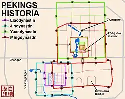 The Liao fell to the Jurchen Jin dynasty in 1122, which gave the city to the Song dynasty and then retook it in 1125 during its conquest of northern China. In 1153, the Jurchen Jin made Beijing their "Central Capital", or Zhongdu.[45] The city was besieged by Genghis Khan's invading Mongolian army in 1213 and razed to the ground two years later.[47] Two generations later, Kublai Khan ordered the construction of Dadu (or Daidu to the Mongols, commonly known as Khanbaliq), a new capital for his Yuan dynasty to the northeast of the Zhongdu ruins. The construction took from 1264 to 1293,[45][47][48] but greatly enhanced the status of a city on the northern fringe of China proper. The city was centered on the Drum Tower slightly to the north of modern Beijing and stretched from the present-day Chang'an Avenue to the northern part of Line 10 subway. Remnants of the Yuan rammed earth wall still stand and are known as the Tucheng.[49]