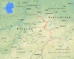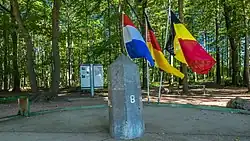 One specific feature of the border is the route of the Vennbahn railway.[2] The Vennbahn railway route has been Belgian territory since 1919, under the provisions of the Treaty of Versailles. The Treaty decided that the former German area of Eupen-Malmedy should be ceded to Belgium, along with the entire Vennbahn railway route which crossed the border several times. Border stones can be found on the right and left of the route. Due to the route of the now defunct railway, six exclaves of Germany, completely surrounded by Belgian territory, as well as one counter-enclave, were created. Today five German enclaves remain surrounded by Belgian territory, consisting of the village Mützenich as well as parts of the districts of Monschaus and Roetgens.[3] Following land swaps, the sixth enclave and the Belgian counter-enclave, no longer exist.