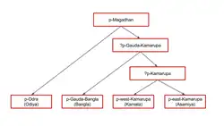 The descent of proto-Gauda, the ancestor of the modern Bengali language, from the proto-Gauda-Kamarupa line of the proto-Magadhan (Magadhi Prakrit).[22]