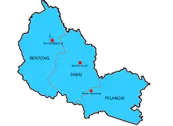 Bentong District is a district located in western Pahang, Malaysia. Bentong covers an area of 1,831 km2 and includes the hill resorts of Genting Highlands and Bukit Tinggi. It is located 80 km northeast of Kuala Lumpur, just across the main range, Titiwangsa Mountains. The eponymous town of Bentong is the seat of the district. The district of Bentong is also further divided into 3 mukims (sub-districts), they are Bentong, Sabai and Pelangai. It is bordered by Selangor's Hulu Langat, Gombak and Hulu Selangor Districts on the west, the Negri district of Jelebu on the south, Bera District on the southeast, Temerloh District to its east, and Raub District to its north.