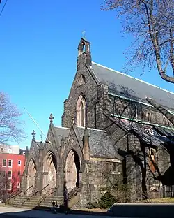 The Bergen Hill Historic District[8] received an opinion of eligibility for New Jersey Register of Historic Places designation (ID#1481) in 1991.[9] It includes Summit Avenue and side streets which feature a mix of late 19th/early 20th architecture that includes brick rowhouses, brownstones, Queen Anne style apartment buildings and private homes. At the foot of avenue is Library Hall, a renovated 1866 building that served as the town hall for Bergen Township then later as Bergen City before it was annexed by Jersey City in 1870. Library Hall is now residences.[10] It travels north to the landmark St. John's Episcopal Church[11] soon after coming in the neighborhood of the Beacon, site of the former Jersey City Medical Center, which since 2016 has been renovated and restored for adaptive reuse as an apartment complex. The neighborhoods' high school, Lincoln High School, is located on Crescent Avenue.