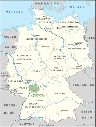 The Bergstraße-Odenwald Nature Park (German: Geo-Naturpark Bergstraße-Odenwald) is a nature park in southern Germany with an area of 3,500 km² that lies between the rivers Rhine, Main (river) and Neckar. In the south it overlaps in places with the Neckar Valley-Odenwald Nature Park on the territory of Baden-Württemberg. In the east it meets the Bavarian Spessart Nature Park at the River Main. The nature park covers parts of the states of Baden-Württemberg, Bavaria and Hesse.