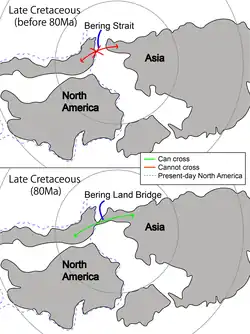 Biogeographical evidence demonstrates previous connections between North America and Asia.[80] Similar dinosaur fossils occur both in Asia and in North America.[81] Saurolophus was found in both Mongolia and western North America.[82] Relatives of Troodon, Triceratops, and Tyrannosaurus rex all came from Asia.[83][84]