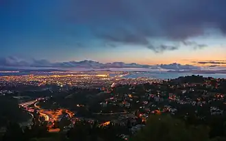 It is common to hear the term "Oakland Hills" to refer to that section of the Berkeley Hills that runs along the east side of Oakland. As a proper name or recognized toponym, it is technically incorrect. When used on maps, the exact south end of the "Berkeley Hills" is unclear, but the maps of the USGS show them stretching well south into the northeastern portion of Oakland.[6] It does not, in any case, correspond to any political boundaries, only to a geographic feature (much as "San Francisco Bay" is not limited to that stretch of the Pacific inlet within the bounds of the City and County of San Francisco). The ridge extends south through Oakland and San Leandro to the drainage of San Leandro Creek called Castro Valley, and geologically, continues southward above the line of the Hayward Fault. In the section above East Oakland to Castro Valley, the ridge appears on most maps as the San Leandro Hills.[7]