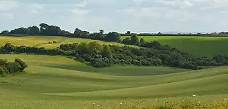 A gently folded succession of sedimentary rocks dating from the Cretaceous period, with some surviving Palaeogene cover and extensive Quaternary deposits, characterise the downlands, which cover the area to the west of Reading and the western edge of the Chiltern Hills.[17] The lower (early) Cretaceous rocks are sandstones and mudstones (now visible only on the slopes of Walbury Hill) whilst those of the upper (late) Cretaceous are the various formations that comprise the Chalk Group. In Berkshire, White Chalk Formation beds tend to be shallower than those further west (Wiltshire) or those in the Chilterns, and often contain layers of chalk rock. Less consolidated Palaeogene clays, sands, gravels and silts of the Lambeth, Thames and Bracklesham Groups overlie these rocks in some areas.[18] These hills, and the valleys that surround them, were shaped by the rivers Kennet,[19] Lambourn,[20] Pang[21] and Enborne, and the Quaternary sands and gravels they brought with them and (in the case of the Kennet) left behind when they changed course.[22]