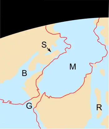 A reconstruction of the paleogeography inferred at the west (Atlantic) end of the Mediterranean Sea during the early- to mid- Miocene; north is to the left.