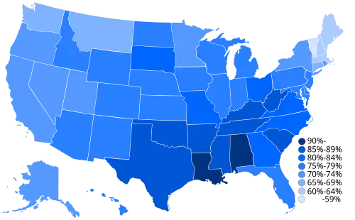 A study by the Pew Research Center in 2016 found that the ten most religious states were Alabama, Mississippi, Tennessee, Louisiana, Arkansas, South Carolina, West Virginia, Georgia, Oklahoma and North Carolina.[11] A 2014 study by the Pew Research Center found that the states with the highest belief in the Bible as the literal word of God were Mississippi (56%), Alabama (51%), South Carolina (49%), West Virginia (47%), Tennessee (46%), Arkansas (45%), Louisiana (44%), Georgia (41%), Kentucky (41%), and Texas (39%).[12]