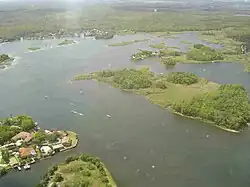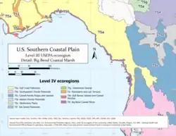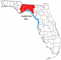 The Big Bend Coast is variously defined as extending from the mouth of the Ochlockonee River, or of the St. Marks River, at the western end of Apalachee Bay, to the mouth of the Anclote River or to Anclote Key, just offshore of that river mouth. It is sometimes divided into two parts, the Big Bend Proper, from the Ochlockonee River to the Withlacoochee River, and the Springs Coast, from the Withlacoochee River to the Anclote River.[1] The northern part of the coast, the Big Bend Proper, is sometimes further divided into four areas for study and discussion purposes: Apalachee Bay, Deadman's Bay (centered on the mouth of the Steinhatchee River), Suwannee Sound (centered on the mouth of the Suwannee River), and Wacasassa Bay.[2] The Big Bend Coast is sometimes a component in the larger Wilderness Coast that also includes the coast west of Apalachee Bay to Cape San Blas.[3] The Big Bend Proper includes the coasts of Wakulla, Jefferson, Taylor, Dixie, and Levy counties, while the Springs Coast includes the coasts of Citrus, Hernando and Pasco counties.