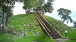 Evidence of human presence in what is now the Big Bend Coast goes back more than 14,000 years, when Paleoindians butchered or scavenged mastodons at the Page-Ladson site on the Aucilla River.[53] Evidence of Paleoindian presence has also been found at the Edward Ball Wakulla Springs State Park, on the Wakulla River, a tributary of the St. Marks River. The seacoast was up to 70 miles (113 km) away from Page-Ladson at the time than it is now, as the sea level was about 100 metres (328 ft) lower.[54] Early sites in the area that have been inundated by rising sea levels include the Econfina Channel site and the J&J Hunt Submerged Archaeological Site, in Apalachee Bay.[55] Surveys of the submerged bottom of Apalachee Bay, concentrating on the PaleoAucilla River channel[b] have found 30 sites yielding pre-historic human artifacts. Sites with artifacts are in water up to 6 metres (20 ft) deep, and up to 15 kilometres (8.1 nmi) from shore.[57] More recent mounds that were formerly on higher ground are now surrounded by water.[58]