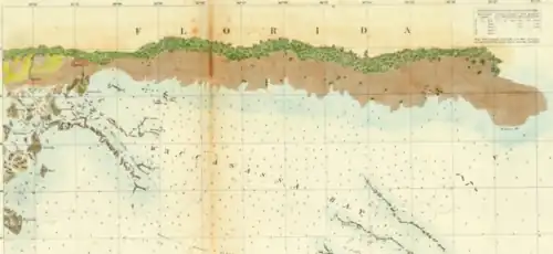 The Big Bend Coast is a drowned karst region, covered with salt marsh and mangrove forests. It includes freshwater springs, oyster reefs, and the delta of the Suwannee River. There are barrier islands west of the Ocklockonee River and south starting with Anclote Key, but there are no barrier islands between those places. The Big Bend Coast has little or no sand or mud. The karst topography has produced an irregular, frequently exposed, bedrock surface.[4][5][6][7] The lack of sand has been a feature of the Big Bend Coast since at least the Pleistocene.[8] Sediment of Holocene origin is generally limited to salt marshes and the nearshore zone, and is redistributed by tidal action and storm events. The Suwannee River carries about 73,000 metric tons of sediment to the coast each year.[9] The Big Bend Coast is on the Gulf Coastal Lowlands of Florida, which has recently exposed ocean-smoothed terraces with Tertiary limestone at or just below the surface. The flatness of the Big Bend Coast is interrupted by an area of relic sand dunes just inland from the Cedar Keys. The presence of a high water table has produced a karst landscape. The limestone hosts the Florida aquifer, which reaches the surface near the coast. Steady discharge from the aquifer supports the discharge of the many springs feeding rivers and streams along the coast and maintains a high water table near the coast.[10]