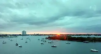The North Bay of Biscayne Bay principally lies between Miami Beach on a barrier island and Miami on the mainland, from Dumfoundling Bay on the north to the Rickenbacker Causeway to the south.[9] Other municipalities on the western shore of the lagoon include Aventura (on Dumfoundling Bay), North Miami Beach, North Miami, and Miami Shores. Municipalities bordering the lagoon on the barrier islands north of Miami Beach include Sunny Isles Beach, Bal Harbour, Bay Harbor Islands, Surfside, and Indian Creek Village. North Bay Village is located on two artificial islands in the middle of the lagoon. North Bay is the part of the lagoon that has been most modified by human works, including channels and other dredged areas, and spoil banks and artificial islands created with material dredged from channels. More than 40% of the area of North Bay had either been dredged or filled to form artificial islands, and more than half of the remaining lagoon bottom is barren. Coastal wetlands have been almost eliminated in North Bay. Turbidity is high in North Bay due to erosion from spoil islands and banks, and the lack of vegetation on the lagoon bottom. The spoil islands host large quantities of invasive plant species.[10][9][6]