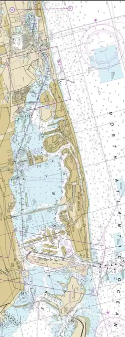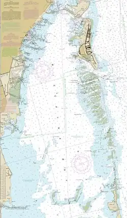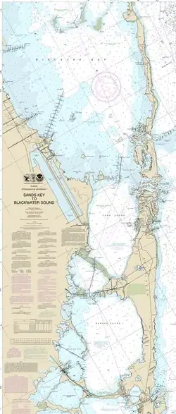 The Safety Valve is a series of shallow sand flats separated by tidal flow channels, stretching about 8 miles (13 km) from the south end of Key Biscayne to the Ragged Keys just north of the Florida Keys. The term "safety valve" was applied to the tidal flats by Ralph Munroe, who argued against building a causeway and bridges connecting Key Biscayne to the Ragged Keys and beyond on the grounds that such construction would block the free outflow of storm surges from the bay across the flats to the ocean. It is believed that it does moderate the effects of storm surges on the bay. The transportation of sand southward along the Atlantic Coast of Florida by longshore drift ends in the area of the Safety Valve. The structure of the Safety Valve has been stable for at least the last century. (The area was called Bocas de Miguel de Mora on Spanish maps and derroteros during the era of Spanish Florida.[18])[19][20][21] Stiltsville is a collection of buildings on pilings on several sand flats at the northern end of the Safety Valve.