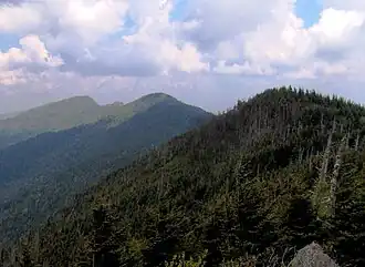 The forests of the Black Mountains are typically divided into three zones based on altitude: the spruce-fir forest, the northern hardwoods, and the Appalachian hardwoods. The southern Appalachian spruce-fir forest, though sometimes referred to as "boreal" or "Canadian," is a unique plant community endemic to a few high peaks of the Southern Appalachians. In fact, it is more akin to a high elevation cloud forest.[8] It is dominated by red spruce and Fraser fir, and coats the elevations above 5,500 feet (1,700 m). The northern hardwoods, which consist primarily of beech, yellow birch, and buckeye, thrive between 4,500 and 5,500 feet (1,400 and 1,700 m). The more diverse Appalachian hardwoods, which include yellow poplar and various species of hickory, oak, and maple, dominate the slopes and stream valleys below 3,000 feet (910 m). Pine forests, consisting chiefly of Table Mountain pine, pitch pine, and Virginia pine, are found on the drier south-facing slopes.[9] mountain paper birch, which is rare in North Carolina, grows sporadically on the slopes of Mount Mitchell.[10]