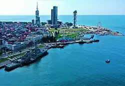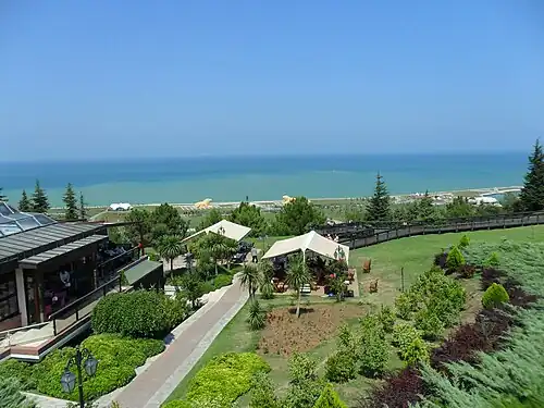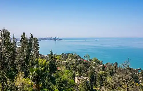 The estuary of the Veleka in the Black Sea. Longshore drift has deposited sediment along the shoreline which has led to the formation of a spit (Sinemorets, Bulgaria). Black Sea coast of western Georgia, with the skyline of Batumi on the horizon Swallow's Nest in CrimeaCoastline of Samsun in TurkeyA sanatorium in Sochi, Russia