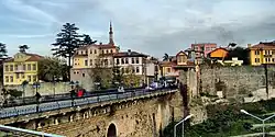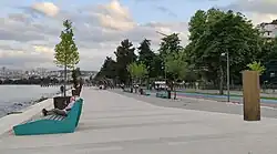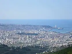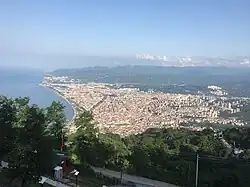 In the west, the coast is generally small floodplains below foothills such as the Strandzha; Cape Emine, a dwindling of the east end of the Balkan Mountains; and the Dobruja Plateau considerably farther north. The longest east–west extent is about 1,175 km (730 mi).[5] Important cities along the coast include (clockwise from the Bosporus) the northern suburbs of Istanbul, Burgas, Varna, Constanța, Odesa, Yevpatoria, Sevastopol, Novorossiysk, Sochi, Poti, Batumi, Rize, Trabzon and Samsun.[6]