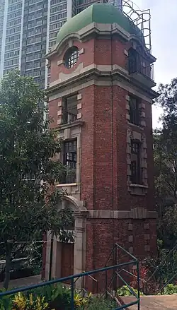 The Signal Hill Tower (訊號塔) was built in the Edwardian style in 1907 at the top of the hill.[4] It was originally a three-storey building. The tower stood at 12.8 metres (42 feet) tall, with a red brick facade. Then, another storey was added to the structure in 1927 for clearer view of the tower from incoming vessels, this heightened it to 18.9 m (62 ft).[5] The windows of the added storey features round windows whereas the original floors have square windows. Prior to the addition, the roof of the building was flat. A dome-shaped roof painted light green was built in replacement. There was a 5+12-metre-long (18-foot) mast which used to contain the time ball atop the building.