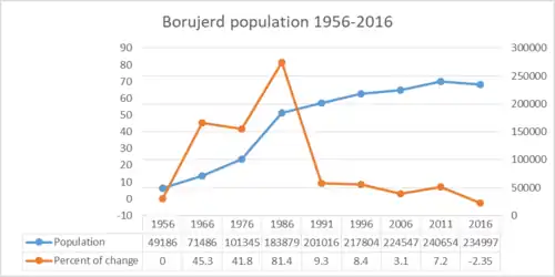 At the time of the 2006 National Census, the city's population was 334,497 in 59,388 households.[6] The following census in 2011 counted 240,654 people in 71,730 households.[7] The 2016 census measured the population of the city as 234,997 people in 74,146 households.[2]
