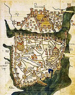 Map of Constantinople (modern-day Istanbul), designed in 1422 by Florentine cartographer Cristoforo Buondelmonti. This is the oldest surviving map of the city, and the only surviving map that predates the Turkish conquest of 1453. The Bosporus is visible along the right-hand side of the map, wrapping vertically around the historic city.