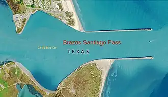 Brazos Santiago Pass is a natural coastal landform located in the Lower Laguna Madre and Lower Rio Grande Valley on the furthest southern beach terrain of the Texas Gulf Coast.[2] The seacoast passage is interpolated by barrier islands encompassing the southern Brazos Island and the northern South Padre Island.[3]