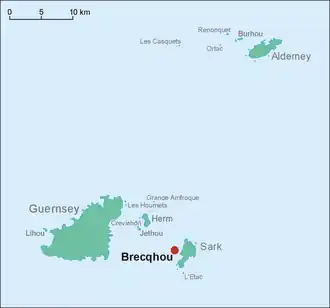 Brecqhou (or Brechou; French pronunciation: [bʁɛku]) is one of the Channel Islands, located off the west coast of Sark where they are now geographically detached from each other. Brecqhou is politically part of both Sark and the Bailiwick of Guernsey. It has been established in the courts that Brecqhou is a tenement of Sark. The Ministry of Justice, the department of the United Kingdom government with responsibility for the Channel Islands,[2] considers Brecqhou part of Sark.[3]