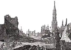 In the 16th and 17th centuries, Brussels was a centre for the lace industry. In addition, Brussels tapestry hung on the walls of castles throughout Europe.[68][69] In 1695, during the Nine Years' War, King Louis XIV of France sent troops to bombard Brussels with artillery. Together with the resulting fire, it was the most destructive event in the entire history of Brussels. The Grand-Place was destroyed, along with 4,000 buildings—a third of all the buildings in the city. The reconstruction of the city centre, effected during subsequent years, profoundly changed its appearance and left numerous traces still visible today.[70]