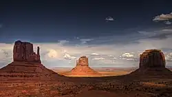 The Mitten Buttes of Monument Valley in the Utah–Arizona state line are two of the most distinctive and widely recognized buttes. Monument Valley and the Mittens provided backgrounds in the scenes of many western-themed films, including seven movies directed by John Ford.[note 1] Another very well-known and frequently photographed butte in northern Arizona is Thumb Butte, which overlooks the city of Prescott and is the most prominent and distinctive geologic landmark in the vicinity. The Devils Tower in northeastern Wyoming is a laccolithic butte composed of igneous rock rather than sandstone, limestone or other sedimentary rocks.[6]