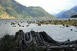 During 1955–1958, the Strathcona Dam was built on Upper Campbell Lake, raising the water level by 30 metres (98 ft).[4] The raised water level coalesced Upper Campbell and Buttle Lake, raising the level of Buttle by 5 meters. Prior to the increase, 600 hectares (1,500 acres) of forest at low-lying areas along the shore was harvested, and in many areas not fully cleared.[5] At times of low water, there exist mudflats with stumps remaining from the forests that formerly stood there.[6]