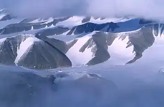 The Byam Martin Mountains are a rugged mountain range extending the length of Bylot Island, Nunavut, Canada. It is one of the most northern ranges in the world and is an extension of the Baffin Mountains, which in turn form part of the Arctic Cordillera mountain system. The highest mountain in the range is Angilaaq Mountain at 1,951 m (6,401 ft), located near the island's center. Sharp peaks and ridges, divided by deep glacier-filled valleys, are typical features in the range[1] and has been extensively modified by glacial erosion. The Byam Martin Mountains have not been conducive to habitation. While there are no permanent settlements in the Byam Martin Mountains, Inuit from Pond Inlet and elsewhere regularly travel to the range.
