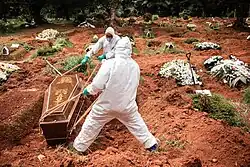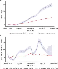 Official death counts have been claimed to underreport the actual death toll, because excess mortality (the number of deaths in a period compared to a long-term average) data show an increase in deaths that is not explained by COVID-19 deaths alone.[73] Using such data, estimates of the true number of deaths from COVID-19 worldwide have included a range from 18.2 to 33.5 million (≈27.4 million) by 18 November 2023 by The Economist,[7][73] as well as over 18.5 million by 1 April 2023 by the Institute for Health Metrics and Evaluation[74] and ≈18.2 million (earlier) deaths between 1 January 2020, and 31 December 2021, by a comprehensive international study.[75] Such deaths include deaths due to healthcare capacity constraints and priorities, as well as reluctance to seek care (to avoid possible infection).[76] Further research may help distinguish the proportions directly caused by COVID-19 from those caused by indirect consequences of the pandemic.[75]