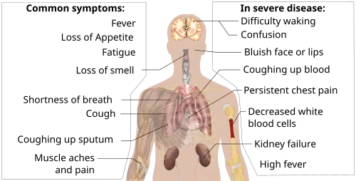 Symptoms of COVID-19 are variable, ranging from mild symptoms to severe illness.[101][102] Common symptoms include headache, loss of smell and taste, nasal congestion and runny nose, cough, muscle pain, sore throat, fever, diarrhoea, and breathing difficulties.[101] People with the same infection may have different symptoms, and their symptoms may change over time. Three common clusters of symptoms have been identified: one respiratory symptom cluster with cough, sputum, shortness of breath, and fever; a musculoskeletal symptom cluster with muscle and joint pain, headache, and fatigue; a cluster of digestive symptoms with abdominal pain, vomiting, and diarrhoea.[103] In people without prior ear, nose, and throat disorders, loss of taste combined with loss of smell is associated with COVID-19 and is reported in as many as 88% of cases.[104][105][106]