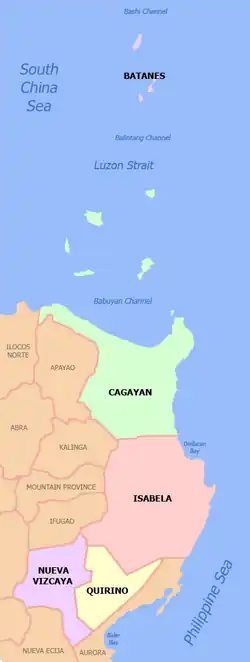 Cagayan Valley (Ilocano: Tanap ti Cagayan; Filipino: Lambak ng Cagayan; Spanish: Valle del Cagayán), designated as Region II, is an administrative region in the Philippines. Located in the northeastern section of Luzon,[5] it is composed of five Philippine provinces: Batanes, Cagayan, Isabela, Nueva Vizcaya, and Quirino. The region hosts four chartered cities: Cauayan, Ilagan, Santiago, and Tuguegarao (the regional center and largest city).[6]