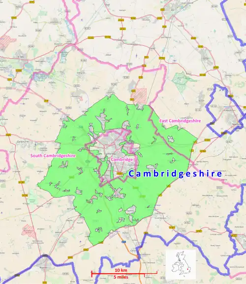 The Cambridge Green Belt is a non-statutory green belt environmental and planning policy that regulates the rural space in the East of England region. It is centred on the city of Cambridge, along with surrounding areas. Essentially, the function of the belt is to control development in and around the Cambridge built up area, to prevent coalescence of nearby villages and preserve the historical character of the city.[1] It is managed by local planning authorities on guidance from central government.