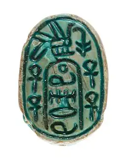 Canaanite Anra scarab showing Egyptian nswt-bjt and ankh symbols bordering a cartouche with an undeciphered sequence of hieroglyphs, c. 1648–1540 BC