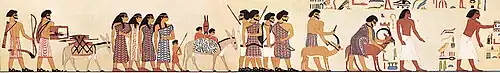 A group of West Asian foreigners, possibly Canaanites, labelled as Aamu (ꜥꜣmw), with the leader labelled as a Hyksos, visiting the Egyptian official Khnumhotep II c. 1900 BC. Tomb of 12th dynasty official Khnumhotep II, at Beni Hasan.[40][41][42][43]