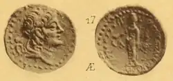 75. ^ a b Cohen, Getzel M. (2006). The Hellenistic Settlements in Syria, the Red Sea Basin, and North Africa. University of California Press. p. 205. ISBN 978-0-520-93102-2. Archived from the original on 29 April 2024. Retrieved 9 October 2018. Berytos, being part of Phoenicia, was under Ptolemaic control until 200 BC. After the battle of Panion Phoenicia and southern Syria passed to the Seleucids. In the second century BC, Laodikeia issued both autonomous as well as quasi-autonomous coins. The autonomous bronze coins had a Tyche on the obverse. The reverse often had Poseidon or Astarte standing on the prow of a ship, the letters BH or [lambda alpha] and the monogram [phi], that is, the initials of Berytos/Laodikeia and Phoenicia, and, on a few coins, the Phoenician legend LL'DK' 'S BKN 'N or LL'DK' 'M BKN 'N, which has been read as "Of Laodikcia which is in Canaan" or "Of Laodikcia Mother in Canaan." The quasi-municipal coins—issued under Antiochos IV Epiphanes (175–164 BC) and continuing with Alexander I Balas (150–145 BC), Demetrios II Nikator (146–138 BC), and Alexander II Zabinas (128–123 n.c.)—contained the king's head on the obverse, and on the reverse the name of the king in Greek, the city name in Phoenician (LL'DK' 'S BKN 'N or LL'DK' 'M BKN 'N), the Greek letters [lambda alpha], and the monogram [phi]. After c. 123 BC, the Phoenician "Of Laodikcia which is in Canaan" / "Of Laodikcia Mother in Canaan" is no longer attested