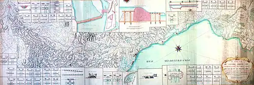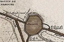 On the Atlantic side, he proposed several layouts: one to pass by Castres and Revel through the Seuil de Graissens and Agout. In fact, this river was already under development for navigation.[27] Another route would pass by the Girou river and avoid Toulouse as in the preceding route. On the Mediterranean side, the route was not set. He would use the Fresquel until the Aude but the arrival on the coast was first intended to be at Narbonne then at Sète.