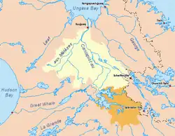 ![]() Drainage basin of the Koksoak River in yellow. Diverted basin of the Caniapiscau River in orange | |
