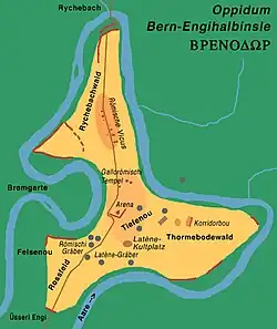 Under the Romans, many of the old fortified places were expanded and refortified. The old Helvetii oppidum at the Engehalbinsel became a Roman vicus, which was probably known as Brenodor or Brenodurum. At the foot of the Jens mountain, the fort Petinesca was built to guard the roads over the Jura Mountains. This was reinforced in the late-Roman era (368–369 CE) by a fortified bridge over the Thielle/Zihl river between Aegerten and Brügg.